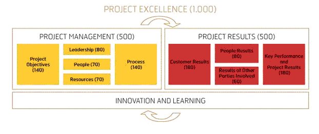 The IPMA Project Excellence Model divides nine assessment criteria into two sections of 500 points: